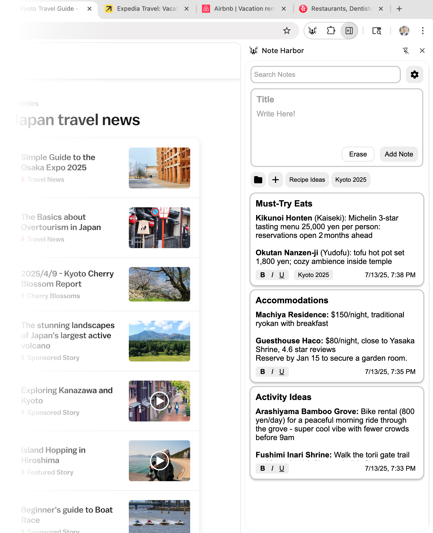 Save flight details, itinerary ideas, and Airbnb comparisons as you browse. Note Harbor stays with you as you hop from tab to tab.